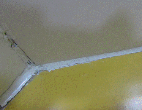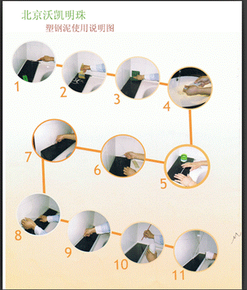 一、施工前提: 该产品是新一代高科技、高性能,高密度双组份反应型纳米陶瓷原料和高分子聚合物。产品具有防霉、防黑、防水超强效果,是厨房、卫生间、台面、浴缸、墙角的边缝最佳处理材料。固化前为胶泥状,固化后坚硬如钢,性能稳定。A、B两组份充分混合后40分钟开始逐渐固化,24小时后达到完全硬化程度; 密着性、附着力强、不发霉、不发黑、不发黄,无毒性,抗酸碱、耐腐蚀、耐候性佳,坚硬如瓷,抗老化达10年以上,完全替代玻璃胶。二、主要用途: 1、酒店、宾馆、别墅等卫生间的浴缸、淋浴房、坐便器、面盆,台面、墙角周边的防水、防霉封边装饰。 2、瓷砖、地砖、大理石、玻璃、陶瓷等的安装、固定、勾缝、修补。 3、管件、线路的固定、接驳、密封和绝缘、防腐。三、使用方法: 1、用美工刀或铲刀等工具将其表面杂质(玻璃胶、氧化物、蜡物、油质等)异物彻底清理干净; 2、先把双手用水沾湿,然后用刀片割开塑钢泥包装袋,A、B各取等量(或按1:1.2比例)充分搅拌均匀成单色后使用; 3、将混合好的材料制成条状后开始操作;将条状材料放到被修补的基体表面;全手工操作; 4、根据基体表面缝隙的大小,选用合适的成型工具(刮子)将其表面制作成型,去除两边多余的塑钢泥,用手粘水把表面抹光滑平整; 5、把散落的泥清理干净。以免粘脏其他部位。粘脏的地方要尽快用湿毛巾来回擦洗干净,时间长了就很难清除了。 6、混合后约有45分钟操作时间,2小时后开始固化,24小时达到最佳效果; 7、为了更加美观,待塑钢泥防水边表面的水干后,还需在其表面进行陶瓷处理。四、注意事项: 1、当室温在25℃左右时,塑钢泥最好用;温度太高,塑钢泥会太软,混合好的泥固化速度加快;温度太低,塑钢泥会很硬,固化速度明显放慢。 2、使用时应避免沾染到其他物体及衣物,如不慎沾染应尽快用水清洗,固化后将难以清除。 3、未使用的A、B两组不可混合;应放回各原包装内,密封好。保存应避免高温。 陶瓷釉面处理方法一、操作步骤: 1、找一矿泉水瓶,去掉上半部分。把陶瓷釉料和固化剂按2:1的比例先后倒入。然后用毛笔(最好是7号画笔)将其搅拌均匀,静放半小时后再用。 2、贴美纹纸。在塑钢泥防水边条的上下两边各贴一道美纹纸。不能压到塑钢泥,跟塑钢泥之间的空隙越小越好。贴的要平整。 3、用毛笔往塑钢泥上刷釉,一般刷两遍,直到颜色均匀为止。 4、刷完后马上撕掉美纹纸。 5、维修,把多余的釉料清理掉,用刀片把边角修理成直线。二、注意事项: 1、生手最好等塑钢泥完全固化后再刷釉,以免破坏塑钢泥防水边条; 2、调配好的釉在1小时~~~2小时间用效果更好,5个小时后还在瓶子里就自行固化掉了。 所以每次调配釉料应少量多次。 为了使各位客户认识现在市面上的不可靠产品及不专业施工工艺,现将不合格产品图片公布如下;请大家认清以免上当受骗!